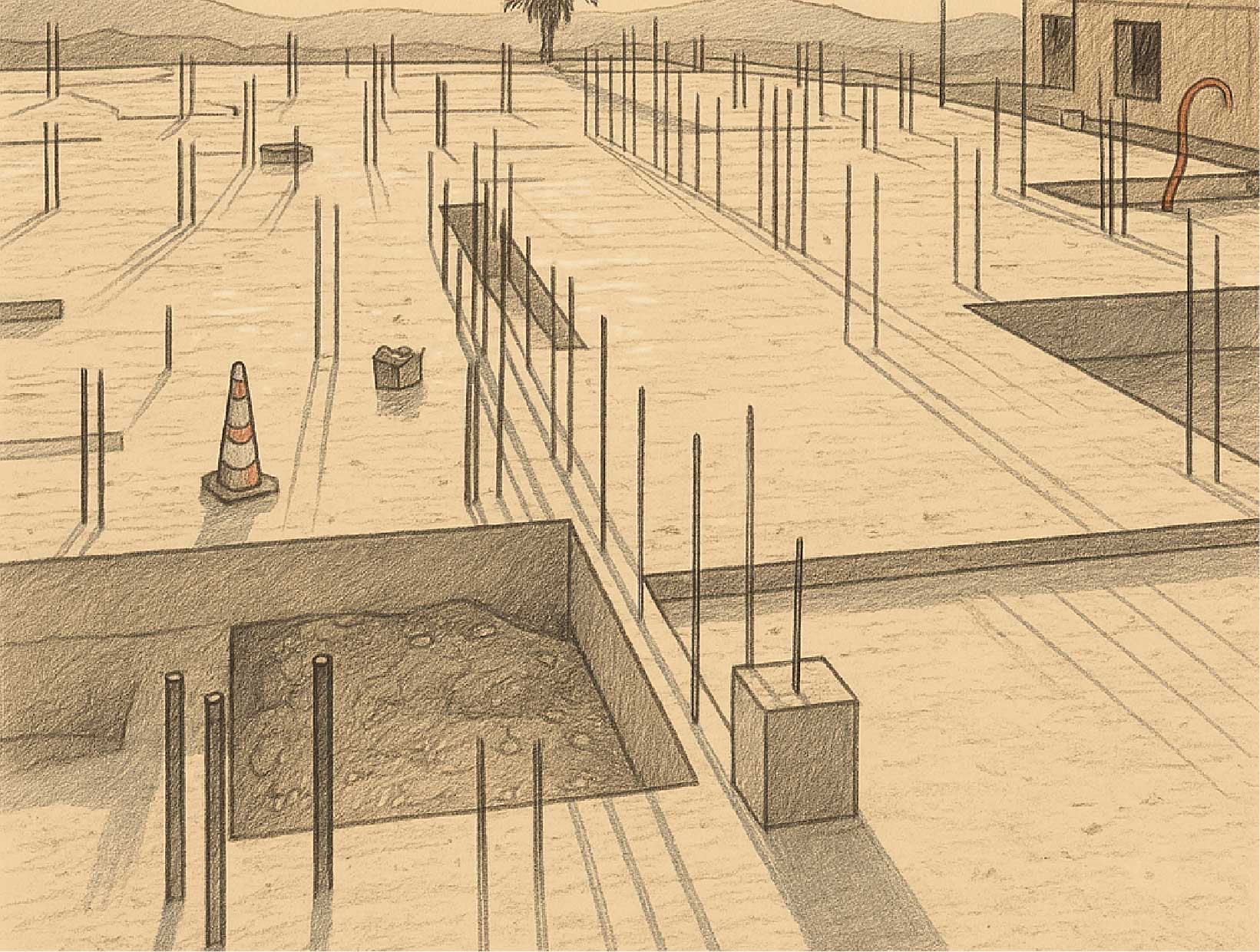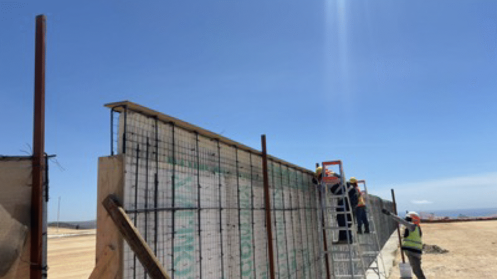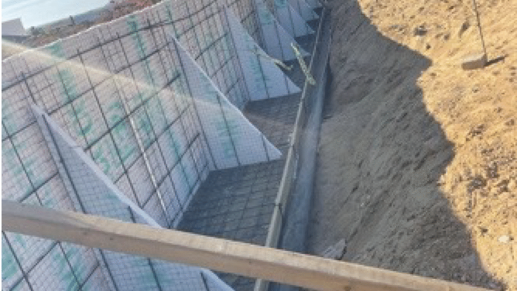Our Solution: Excavation is performed for the installation of a reinforced concrete footing with rebar. Rebar tips are left protruding from this footing to anchor the panel. Subsequently, the reinforced panel is placed, and screeds/rules are set to align the panel and allow for shotcrete/mortar application.
