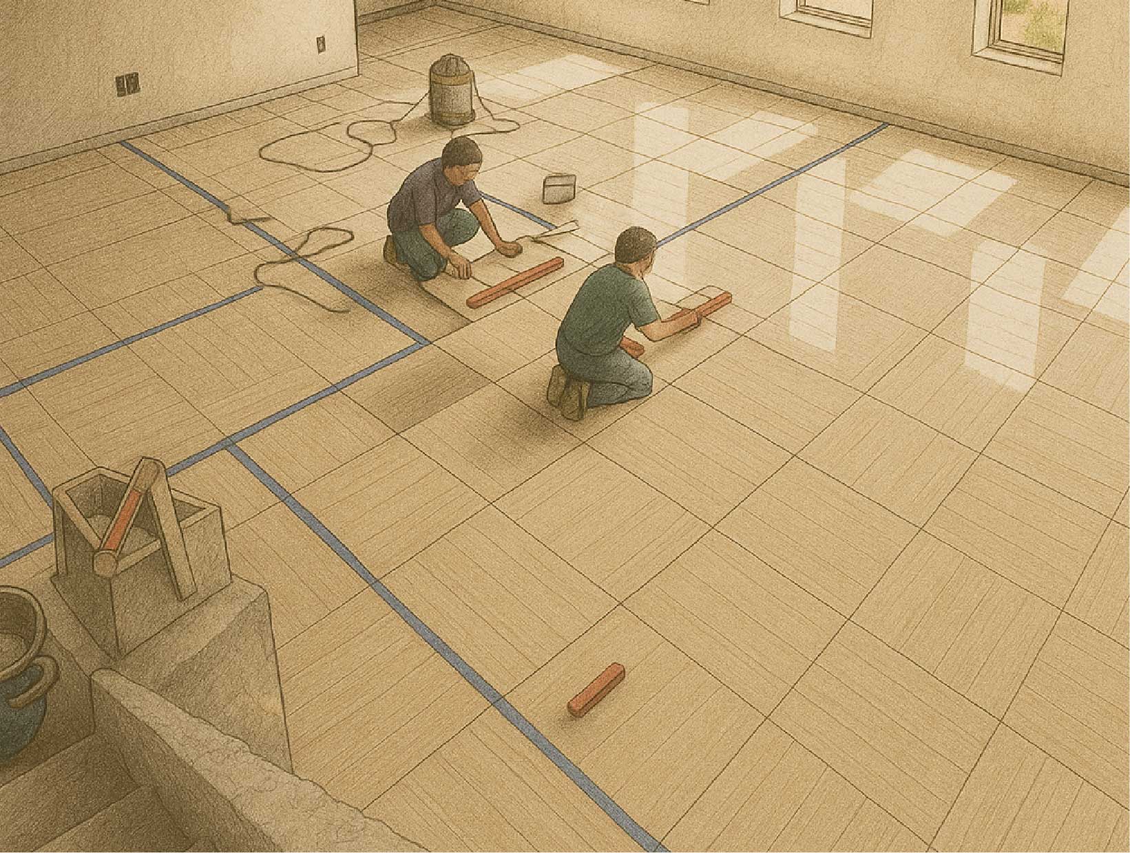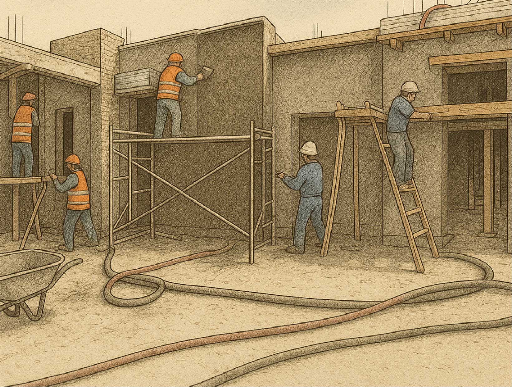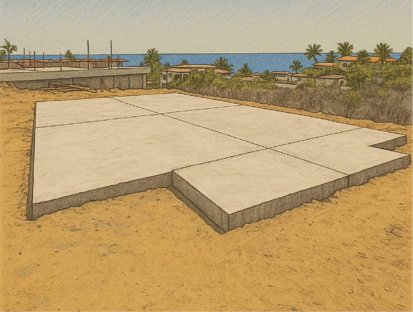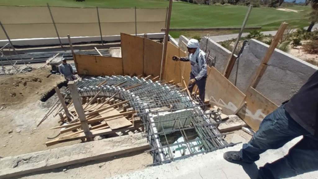 The process begins with preparing a solid base: a monolithic poured slab that ensures stability, structural strength, and firm anchorage for the installation of the panels.