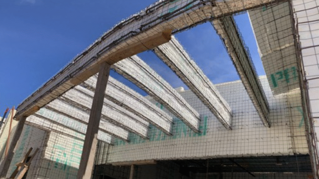 Our Solution: Reinforcement was placed in the roof slab using rods to simulate a beam from wall to wall. Since it is a panel system, we have the flexibility to assemble and support 100% of the slab.